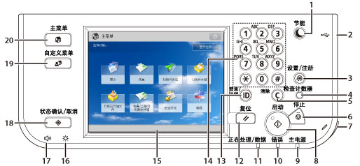 包括操作本机所需的按键、触摸面板显示屏幕和指示灯。(请参阅“操作面板部件及其功能”)