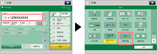 如果在“设置/注册”的[默认屏幕]中将[显示选择线路屏幕]设置为“打开”,从“主菜单”屏幕选择[传真]时,会显示选择线路的屏幕。(请参阅“更改传真的默认屏幕”)