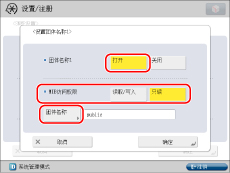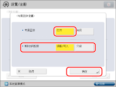 按<使用SNMP v.1>的[打开]→[专用团体设置]。为<专用团体>按[打开]→<MIB访问权限>按[读取/写入]。