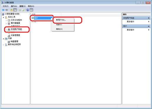 对于Windows XP,右键单击[我的电脑]→单击[管理]→[计算机管理(本地)]→[本地用户和组]→右键单击[用户]→选择[新用户]。对于Windows Vista/Windows 7,单击