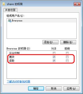 单击[权限]→检查是否选择了允许访问共享文件夹的用户名或组名→检查[更改]和[读取]已选择[允许]。