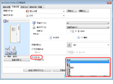 可以在使用应用程序创建的文档上打印水印(如“机密”或“副本”)。除预定义的水印外,也可以注册自定义水印。