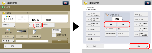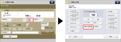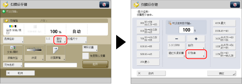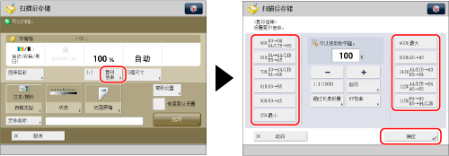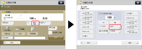 如果将原稿放置在稿台玻璃上,假设可以检测到原稿尺寸,则关闭输稿器后会自动出现缩放倍率。