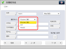 要将文件保存到安装了“彩色网络打印服务器”的imageRUNNER ADVANCE机器的“高级存储箱”中,请选择[WebDAV]。(不能使用Windows(SMB)。)
