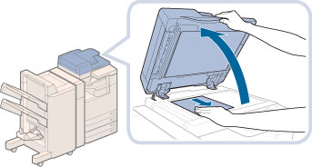 기기의 피더/원고대 커버 위에는 열기/닫기 센서가 장착되어 있습니다(위 그림의 동그라미 친 부분을 참고하십시오). 원고를 원고대 유리에 세트하는 경우, 피더/원고대 커버에서 센서가 분리되도록 피더/원고대 커버를 약 300mm 들어올리십시오. 센서가 피더/원고대 커버에서 분리되지 않으면 원고 크기가 올바르게 탐지되지 않습니다.
