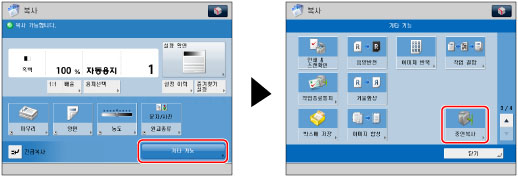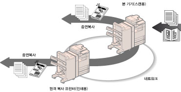 중연 복사 모드의 경우, 지정된 복사 매수가 기기와 중연 복사 프린터로 반으로 나누어집니다. 복사 매수가 홀수로 설정된 경우 중연 복사 프린터보다 기기에서 1매 더 인쇄됩니다.