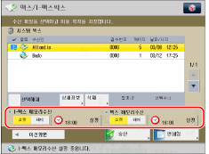 [기능 설정] (설정/등록)의 [팩스/I-팩스 박스 설정]에 [메모리 수신 시작시각]/[메모리 수신 종료시각]이 설정 된 경우 다음이 표시됩니다.