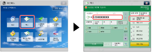 [팩스]를 누르고 → 원하는 수신인을 지정한 후 → 해상도 버튼을 누릅니다.