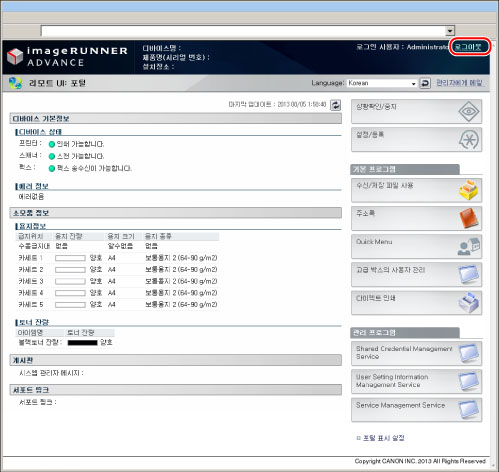 조작을 완료했으면 [로그아웃]을 누르거나 조작 패널의