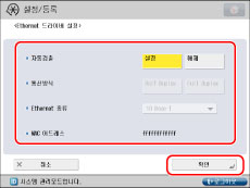 [네트워크]에서 [Ethernet 드라이버 설정]을 누르고 → 다음 항목을 지정한 후 → [확인]을 누릅니다.