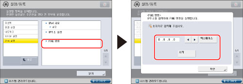 [IPv4 설정]에서 [PING 명령]을 누르고 → 네트워크에 있는 IPv4 주소를 입력한 후 → [시작]을 누릅니다.
