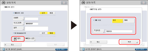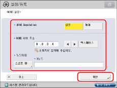 [SMB 프린터 설정]을 누르고 → SMB 프린터 설정을 지정한 후 → [확인]을 누릅니다.