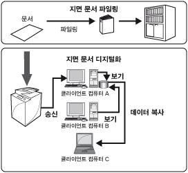 별도의 전달 서버가 필요하지 않으며 imageRUNNER ADVANCE 기기 및 컴퓨터에 액세스할 수 있는 누구라도 간편하게 종이 문서를 디지털화 할 수 있습니다.