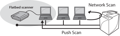 네트워크 스캔 기능을 사용하면 컴퓨터를 사용하는 imageRUNNER ADVANCE 기기에 놓여 있는 원고를 평판 스캐너와 같은 방식으로 스캔할 수 있습니다.