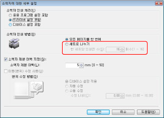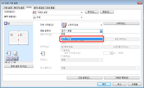 [소책자]을 클릭했을 때 표시되는 [소책자에 대한 세부 설정] 대화상자에서 레이아웃 등 제본에 대한 상세 설정을 지정할 수 있습니다.