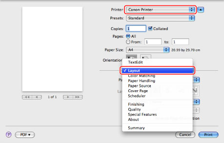 사용할 프린터를 선택하고 → [레이아웃]을 선택합니다.