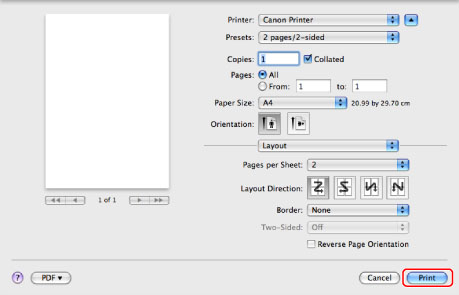 사용할 프린터를 선택하고 → [미리 설정] 드롭다운 리스트에서 [2페이지/양면]을 선택합니다.