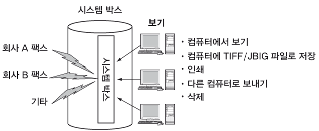 팩스, 인터넷 팩스 및 인트라넷 팩스를 통해 수신한 문서는 기기의 내장 하드 디스크의 시스템 박스에 임시로 저장됩니다. 수신한 문서는 아래 그림처럼 처리할 수 있습니다.