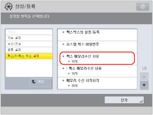 (설정/등록) → [기능 설정] → [수신/전송] → [공통 설정] → [팩스/I-팩스 박스 설정] → [팩스 메모리수신 사용]을 누릅니다.