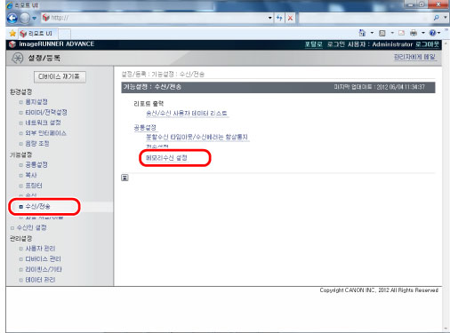 리모트 UI에 액세스하고 → [설정/등록]을 클릭한 다음 → <기능 설정>에서 [수신/전송]을 클릭한 다음 → [메모리수신 설정]을 클릭합니다.