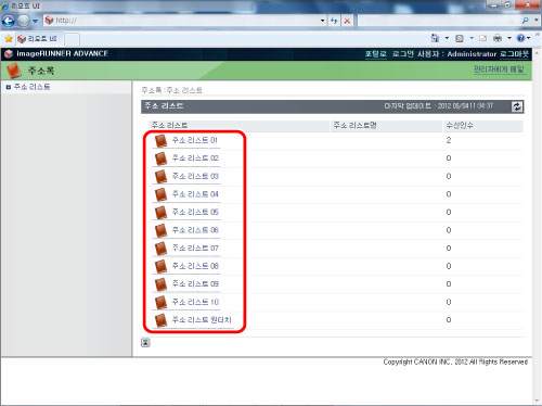 리모트 UI에 액세스하고 → [주소록]을 클릭한 다음 수신인을 등록할 주소 리스트를 클릭합니다.