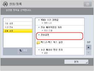 (설정/등록) → [기능 설정] → [수신/전송] → [공통 설정] → [전송설정]을 누릅니다.