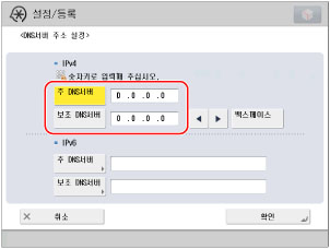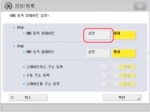 (설정/등록) → [환경 설정] → [네트워크] → [TCP/IP 설정] → [DNS 설정] → [DNS 서버 주소 설정]을 누릅니다.