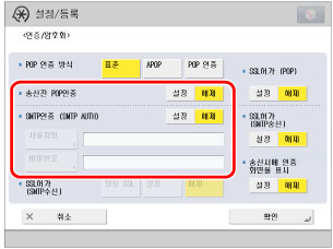 제공자가 "SMTP 전 POP" 송신 인증 시스템을 사용하는 경우 이 설정을 '설정'으로 지정합니다.