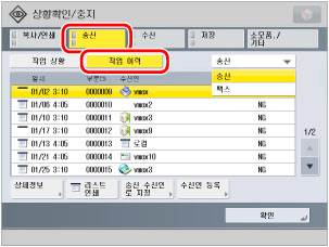 (상황확인/중지) → [송신] → [이력]을 누르고 → 작업의 송신 성공 여부를 확인합니다.