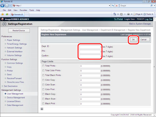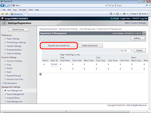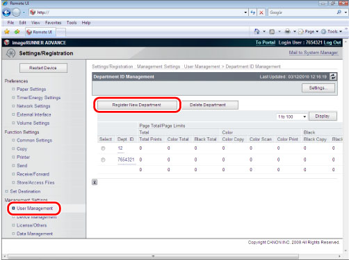 리모트 UI에 액세스하고 → [설정/등록] → [사용자 관리] → [부문별 ID 관리] → [신규부문 등록]을 클릭합니다.