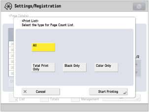 터치 패널 화면에 현재 표시된 부서에 대한 카운터 정보를 인쇄하려면 [카운트 인쇄]를 누릅니다.