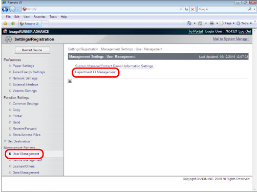 리모트 UI에 액세스하고 → [설정/등록] → [사용자 관리] → [부문별 ID 관리]를 클릭합니다.