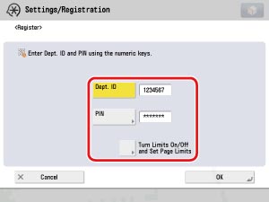 부문 ID 및 비밀번호를 지정하고 → [제한 설정/해제와 제한면수 설정]을 누릅니다.