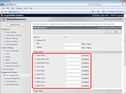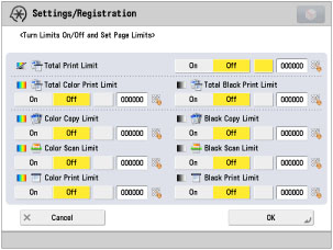 제한면수 모드를 사용하면 부서별로 복사/스캔/인쇄가 허용되는 최대 페이지 수를 지정할 수 있습니다. 카운터가 지정된 숫자에 도달하면 기기에서 작업이 중지됩니다. 다음에 대해 제한면수를 설정할 수 있습니다.