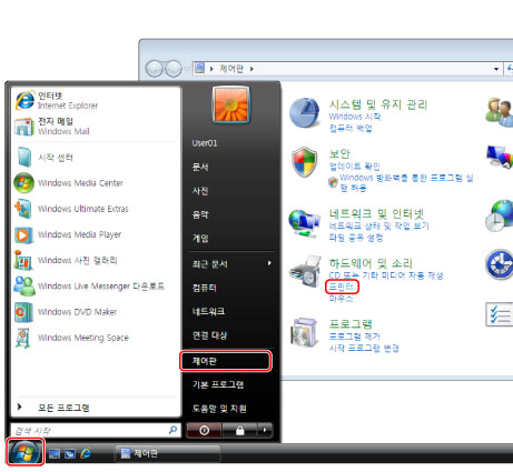 ](시작)을 클릭하고 → [제어판] → [프린터]를 선택합니다. Windows 7의 경우 [