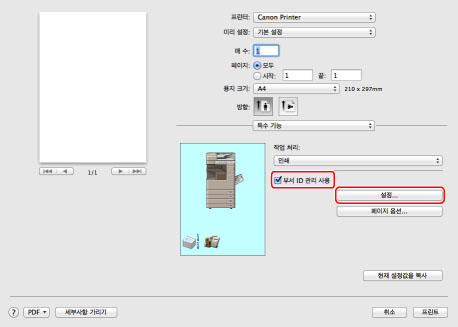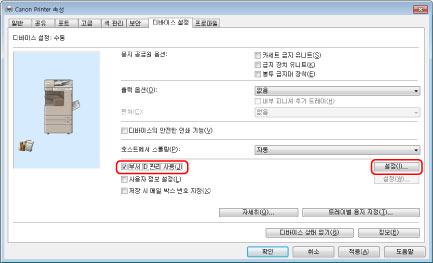 [인쇄 시 부서 ID/PIN 확인]을 선택하여 기기에 저장된 정보와 인증 시점을 설정합니다.