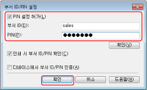 [확인]을 클릭하여 프린터에 연결해서 등록한 부문 ID 및 비밀번호가 올바른지 여부를 확인합니다.