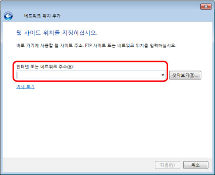 Windows Vista/Windows 7의 경우 [컴퓨터]를 클릭하고 → 표시된 폴더의 빈 영역을 오른쪽 버튼으로 클릭한 다음 → [네트워크 위치 추가] → [다음] → [다음]을 클릭하고 → <인터넷 또는 네트워크 주소:> 아래에 다음 경로(대/소문자 구분)를 입력합니다.