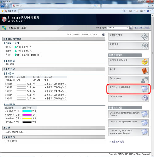 고급 박스는 정보 공유를 위한 저장소입니다. 이 기기의 고급 박스에 스캔한 문서를 저장하여 컴퓨터에서 해당 파일을 봄으로써 전자 통신을 수행할 수 있습니다.