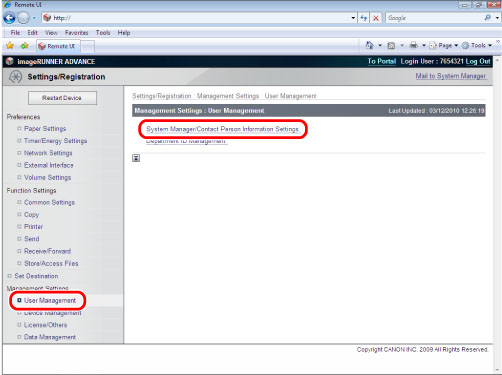 리모트 UI에 액세스하고 → [설정/등록] → [사용자 관리] → [시스템 관리자 정보/서비스 담당자 정보 설정]을 클릭합니다.