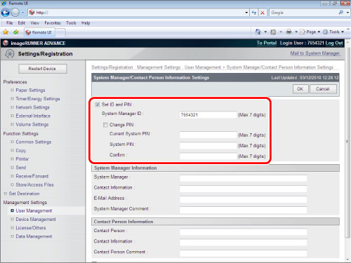 [ID와 PIN 번호 설정]을 선택하고 → [시스템 관리 부문 ID]에 최대 7자리를 입력한 다음 → [PIN 번호 변경]을 선택하고 → [시스템 PIN 번호] 및 [확인입력]에서 최대 7자리를 입력합니다. 설정/등록에 로그인할 때 시스템 관리 부문 ID와 시스템 비밀번호가 필요합니다.