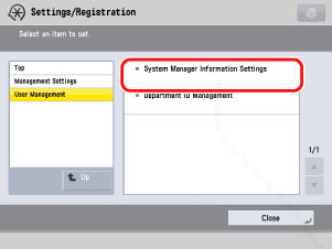 (설정/등록) → [관리설정] → [사용자 관리] → [시스템 관리자정보 설정]을 누릅니다.