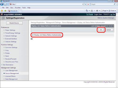 인증 전의 작업 상황 표시 설정을 지정하려면 [인증 전의 작업상황 표시]를 클릭하고 → [인증 전의 작업상황 표시]의 선택을 취소한 다음 → [확인]을 클릭합니다.