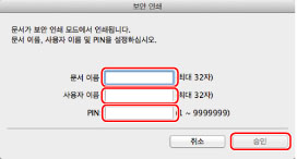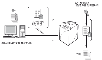 기기에서 인쇄하려면 비밀번호를 다시 입력해야 합니다. 문서에서 비밀번호가 설정된 후에는 비밀번호를 적어서 안전한 곳에 보관합니다.