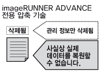 기기의 화면이나 네트워크 컴퓨터에서 기기의 하드 디스크에 있는 실제 데이터에 액세스할 수 없습니다. 또한 기기의 하드 디스크를 제거 및 분석하는 것은 프로세스에서 Canon의 기밀 imageRUNNER ADVANCE 펌웨어 및 데이터 압축 기술을 분석해야 하므로 사실상 불가능합니다.