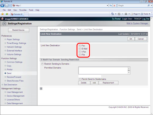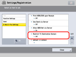 (설정/등록) → [기능 설정] → [송신] → [이메일/I-팩스 설정] → [송신처 도메인 제한]을 누릅니다.