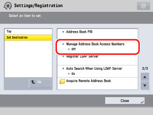 (설정/등록) → [수신인 설정] → [주소록 액세스 번호 관리]를 누릅니다.