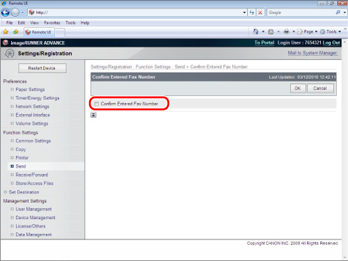 (설정/등록) → [기능 설정] → [송신] → [팩스설정] → [팩스번호 입력시 확인입력]을 누릅니다.
