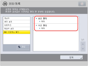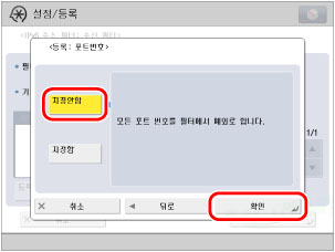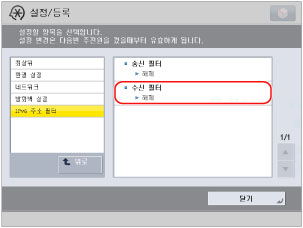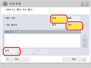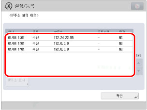 [설정/등록] → <환경 설정>에서 [네트워크 설정] → [IP 주소 블럭 이력]을 누릅니다.