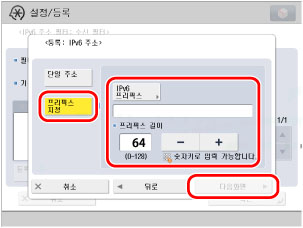 [프리픽스 지정]을 누르고 → [IPv6 프리픽스]에 'fec0:0:0:1::1234'를 입력한 다음 → [프리픽스 길이]에 '64'를 입력하고 → [다음화면]을 누릅니다.